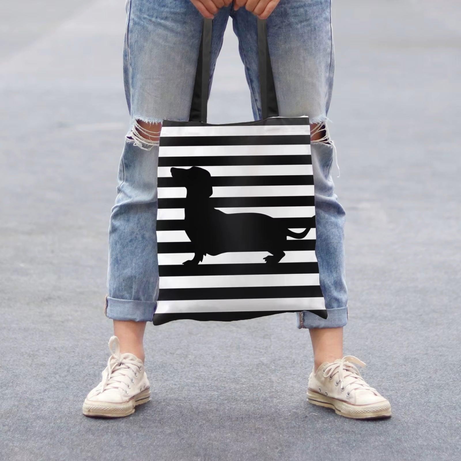 Diese stylische Tragetasche mit Dackelmotiv ist ein echter Hingucker für alle Hundefans. Das moderne schwarz-weiße Streifen-Design kombiniert mit der markanten Dackel-Silhouette verleiht der Tasche einen zeitlosen Look – perfekt für Alltag, Shopping oder Freizeit.